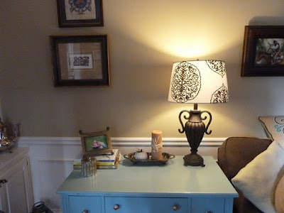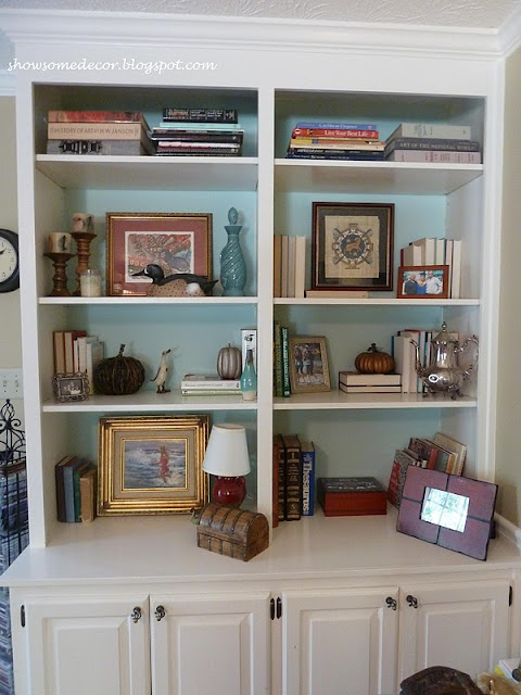 I’m really loving the blues, tans, browns, and creams together. I have metallics in there as well: gold frames, silver serving pieces, and my caramel latte metallic pumpkins. Blue was definitely the right accent color for the bookcases. But did I get the right blue?