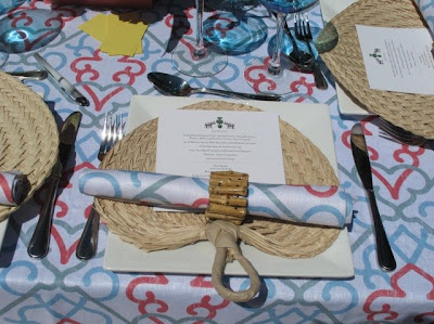 Love the layered place settings with the fans! “Classic Hamptons Meets Malibu Chic” is the theme.