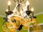 orange ribbon and spiderwebs on the chandelier