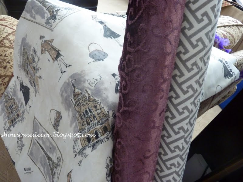 I wanted the skirt to use two of these fabrics, the Tres Chic by Waverly and the Cross Section by PKL Studios.  The purple velvet is for accent pillows down the road.