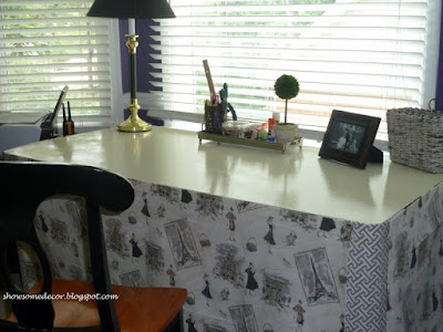 I knew I wanted to cover the table and conceal all the fab storage that’s underneath, but I didn’t want it completely covered in fabric.  I love the tailored look on these inspiration desks.