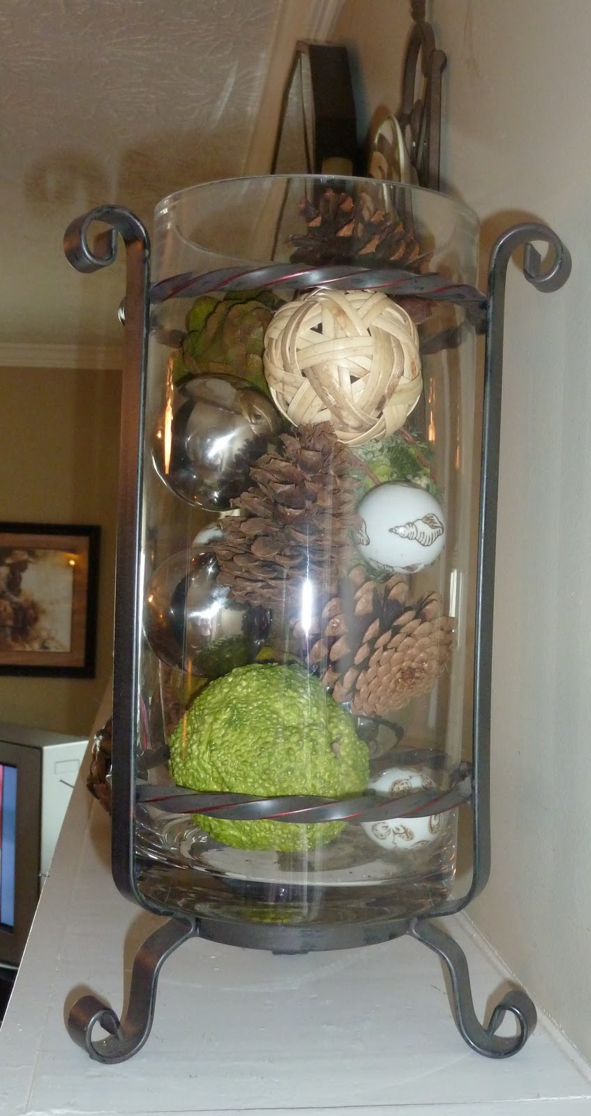 The hurricane is my Willow House large Galveston Footed Hurricane. I love that the iron echoes my sconces (and my firescreen), but the glass keeps it visually light. I added more spheres here mixed in with a few pinecones and artichokes. The silver spheres I picked up at Target the other day– perfect for adding another reflective surface and once again mixing textures.