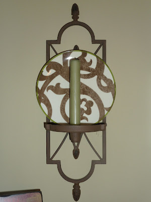 So here is what I ended up with and I love it!  I picked up the mirror last week at Ballard’s Backroom here in Roswell (outlet for the incredible catalog).  It has a teeny scratch on the outer edge, but I’ve had my eye on this one for quite some time and last week was an additional 30% off wall art and mirrors.  ‘Nuff said.  The sconces are Willow House Cordova Sconces and to brighten them up, I added two of our Terrace Appetizer Plates behind the tapers.